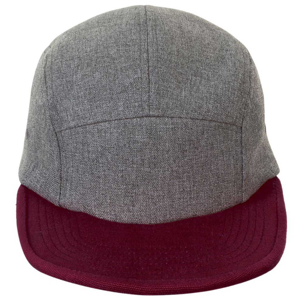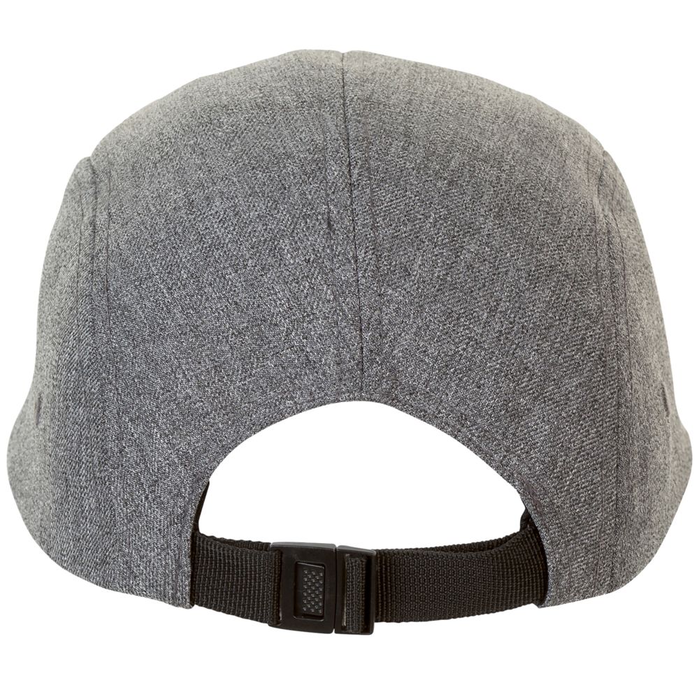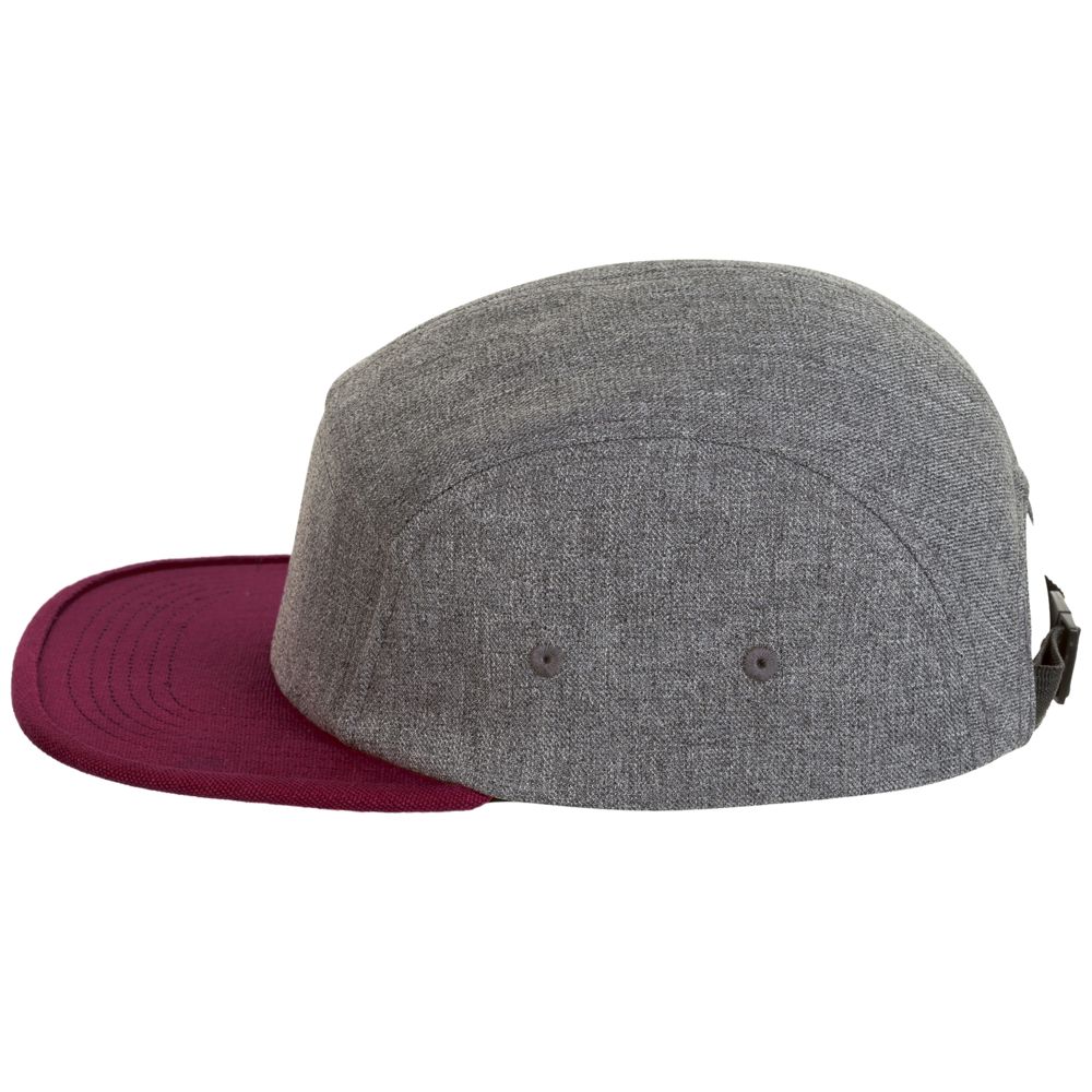 Двухцветная меланжевая бейсболка с 5 клиньями. Плоский козырек, 4 отверстия для вентиляции с обшитыми люверсами, регулируемая пластиковая застежка сзади.