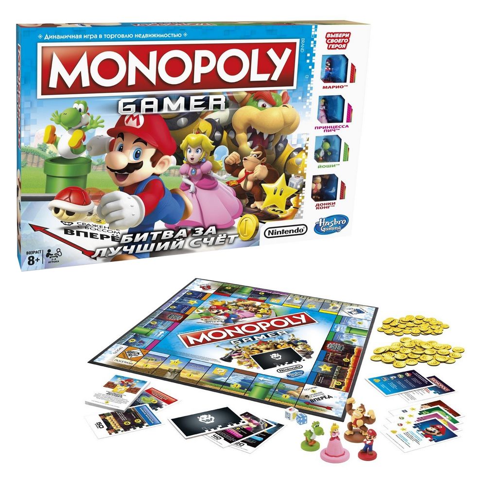 В версии «Монополия. Геймер» удачно сочетается механика самой популярной настольной игры в мире и визуальное оформление, основанное на известных видеоиграх. Игрокам предоставляется возможность перенестись в знакомые локации и сыграть за любимого персонажа из игр Nintendo: Марио, Принцессу Пинч, Йоши или Донки Конга.