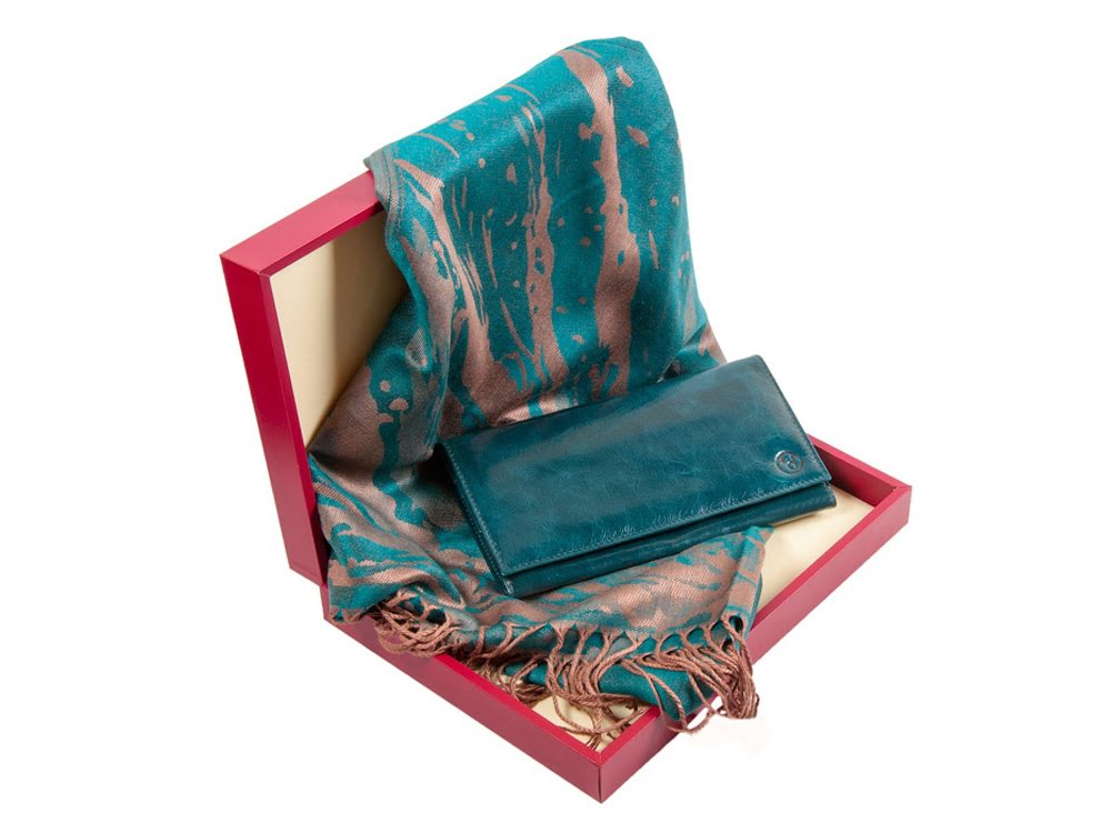 Подарочный набор с оригинальным кожаным кошельком цвета морской волны и элегантным шарфом, морская волна, кожа, 40% шелк/ 60% полиэстер